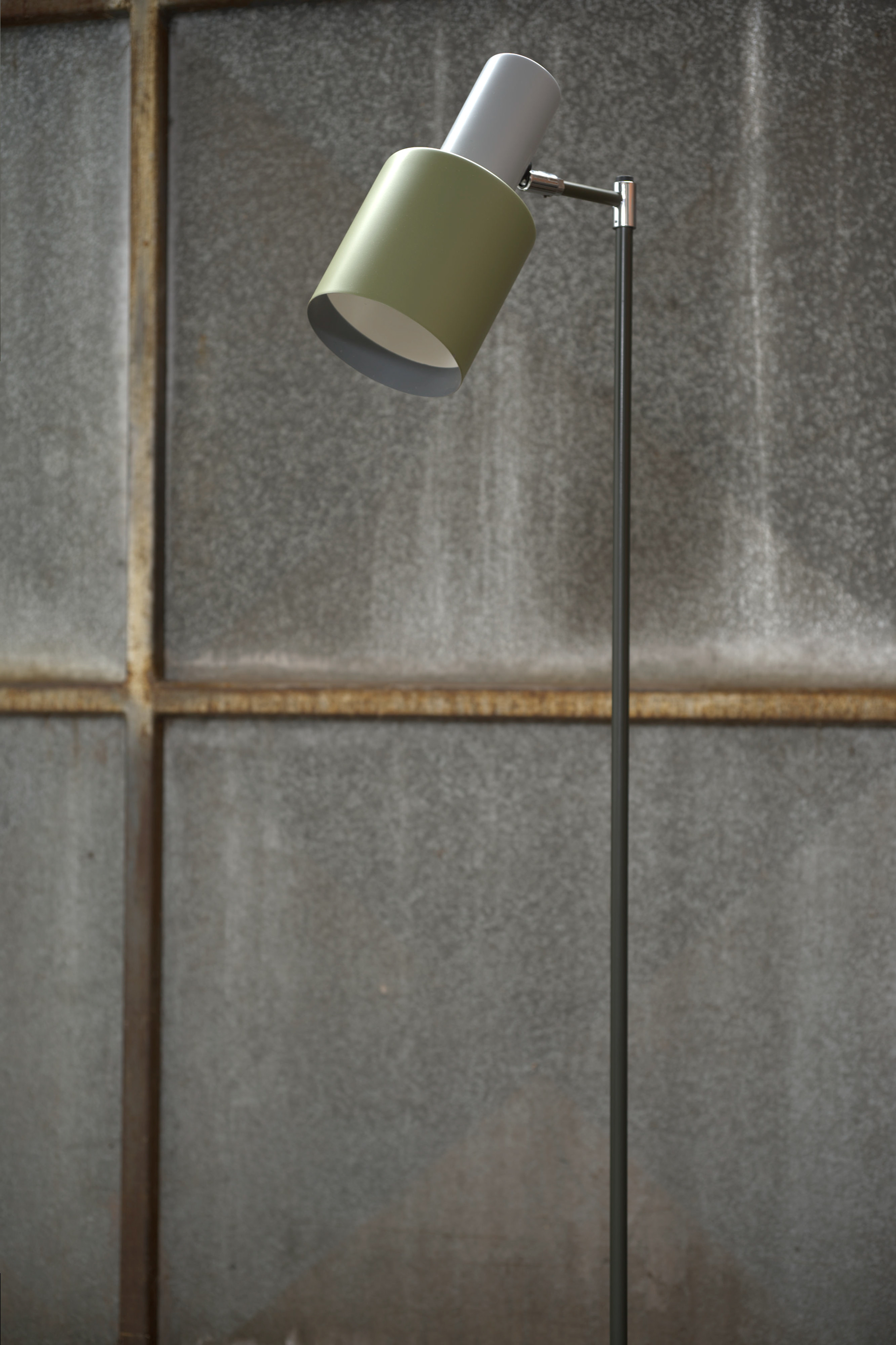 'Studio' floor lamp by Jo Hammerborg for Fog & Mørup (Denmark, 1960s). A simple but timeless design. It’s made out of metal and has been repainted in beautiful green and grey tints. Adjustable in angle. In very good condition with some scratches on the base. One small paint chip on the hood.