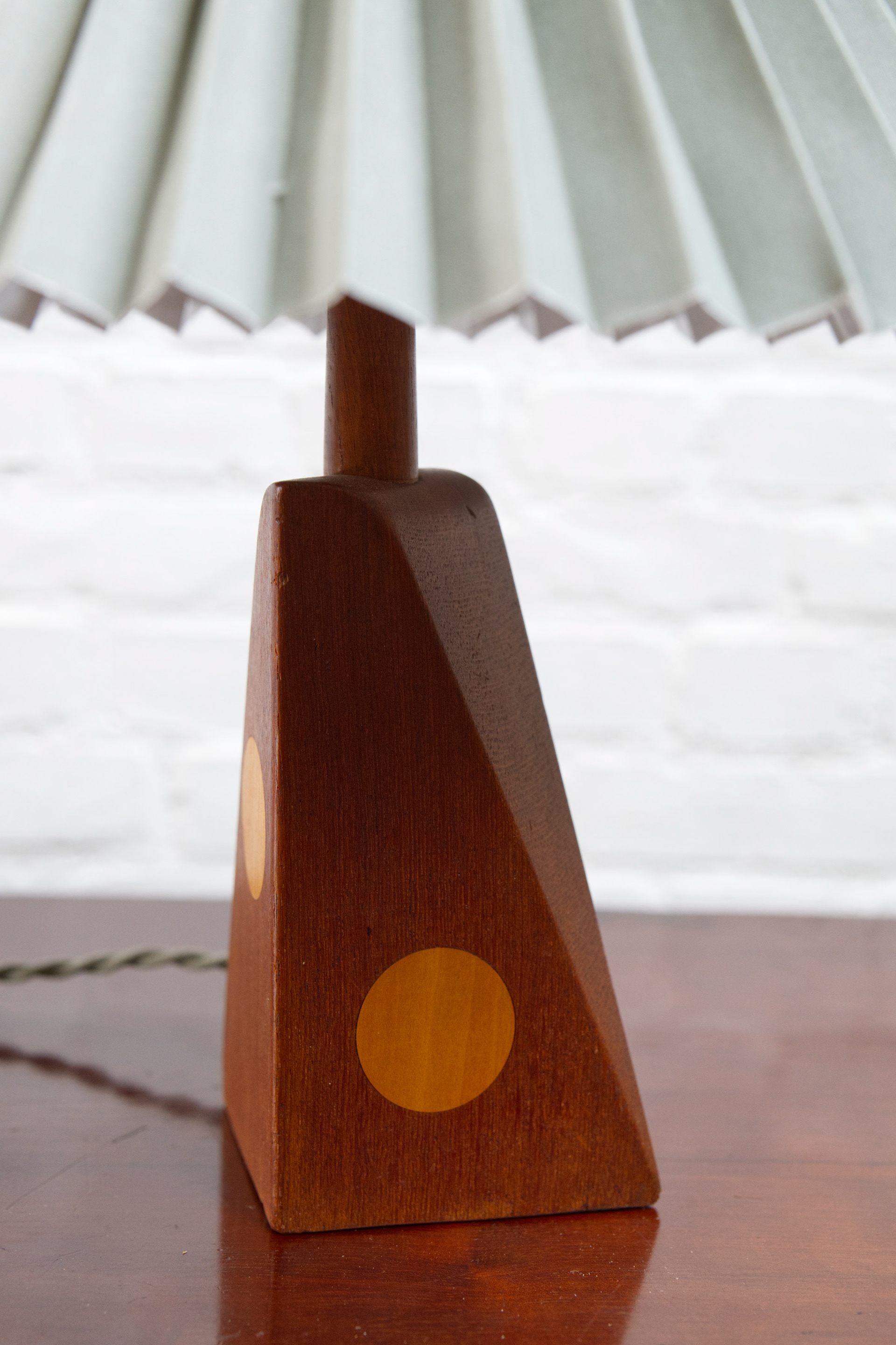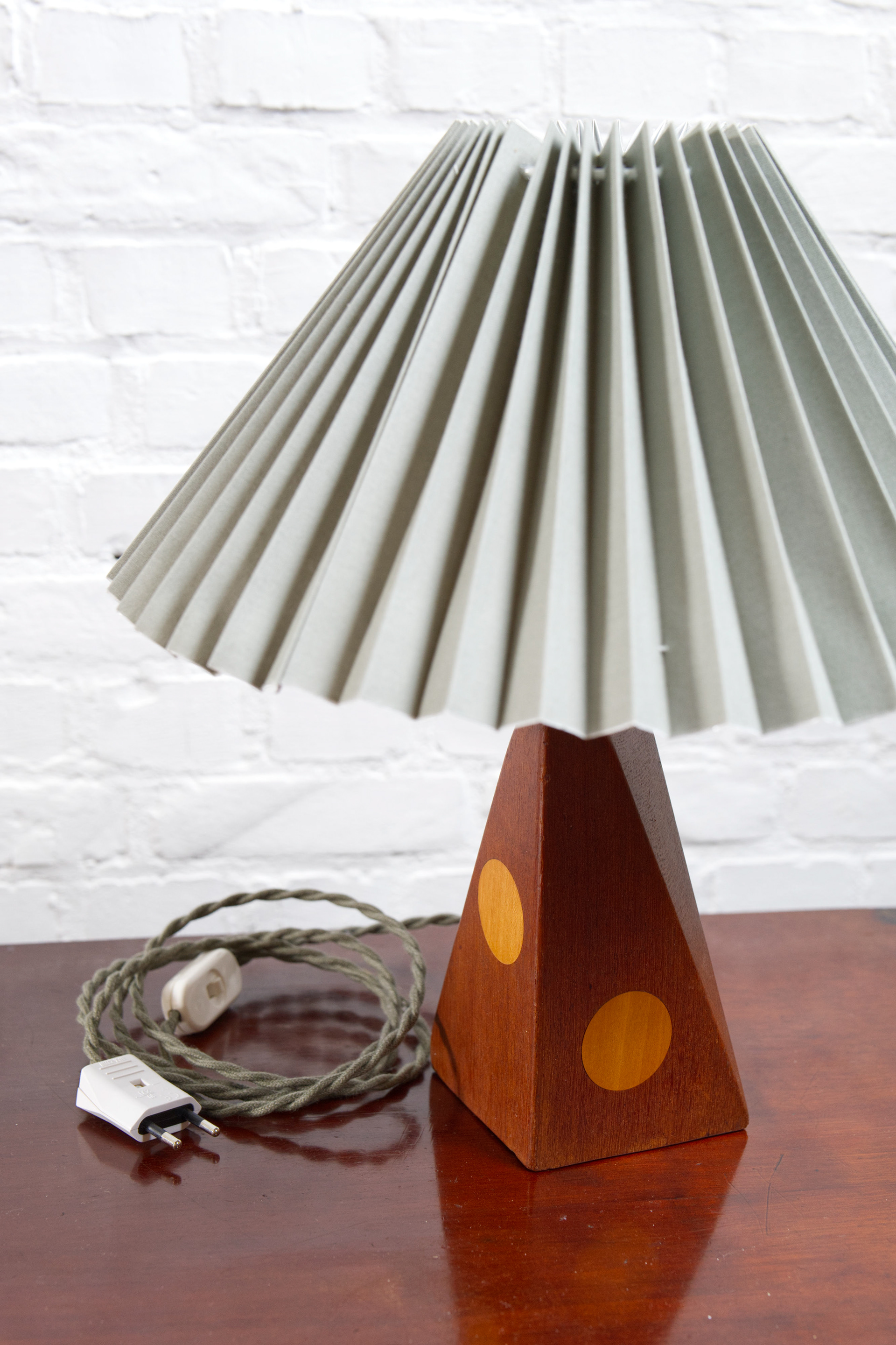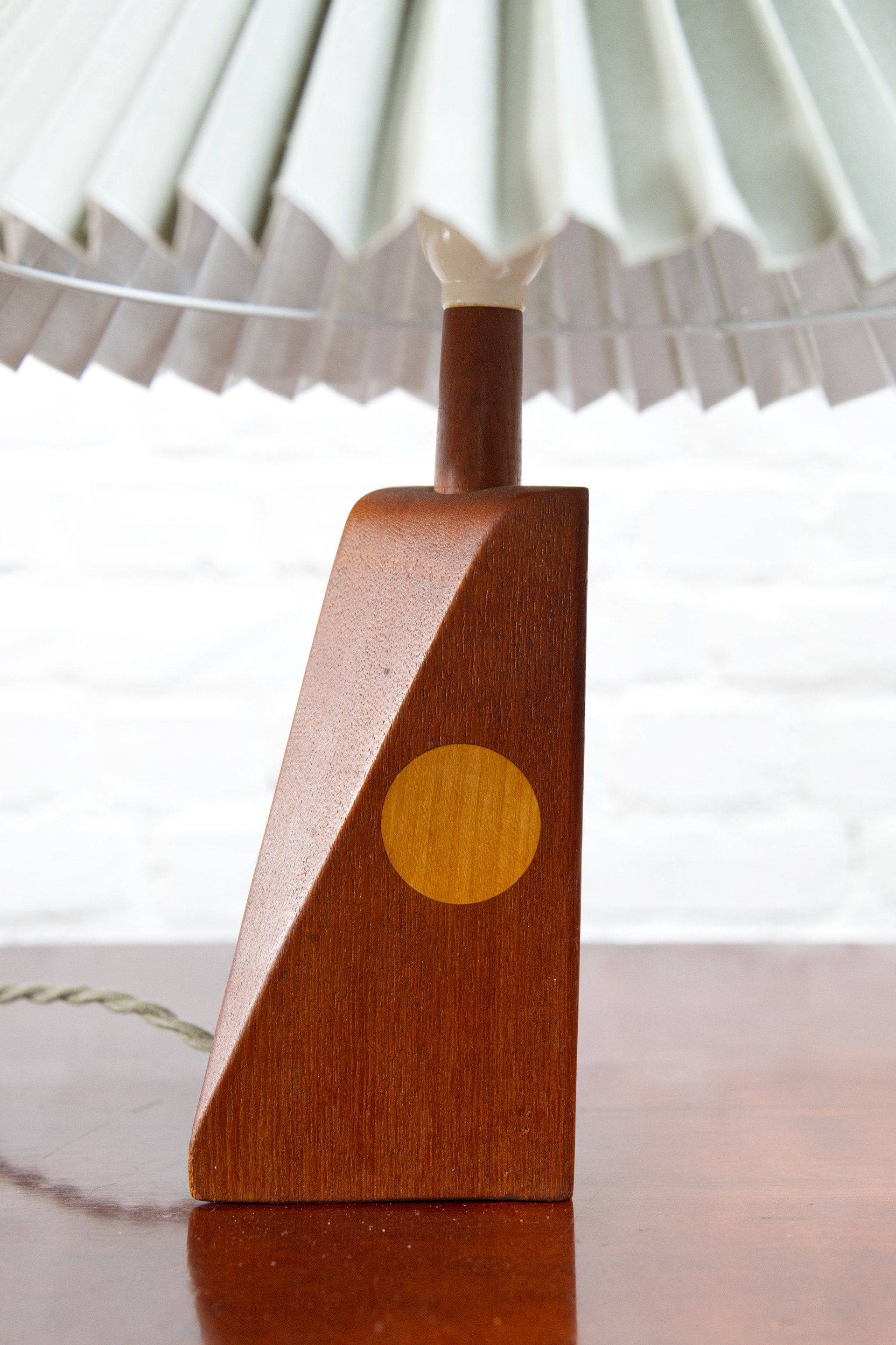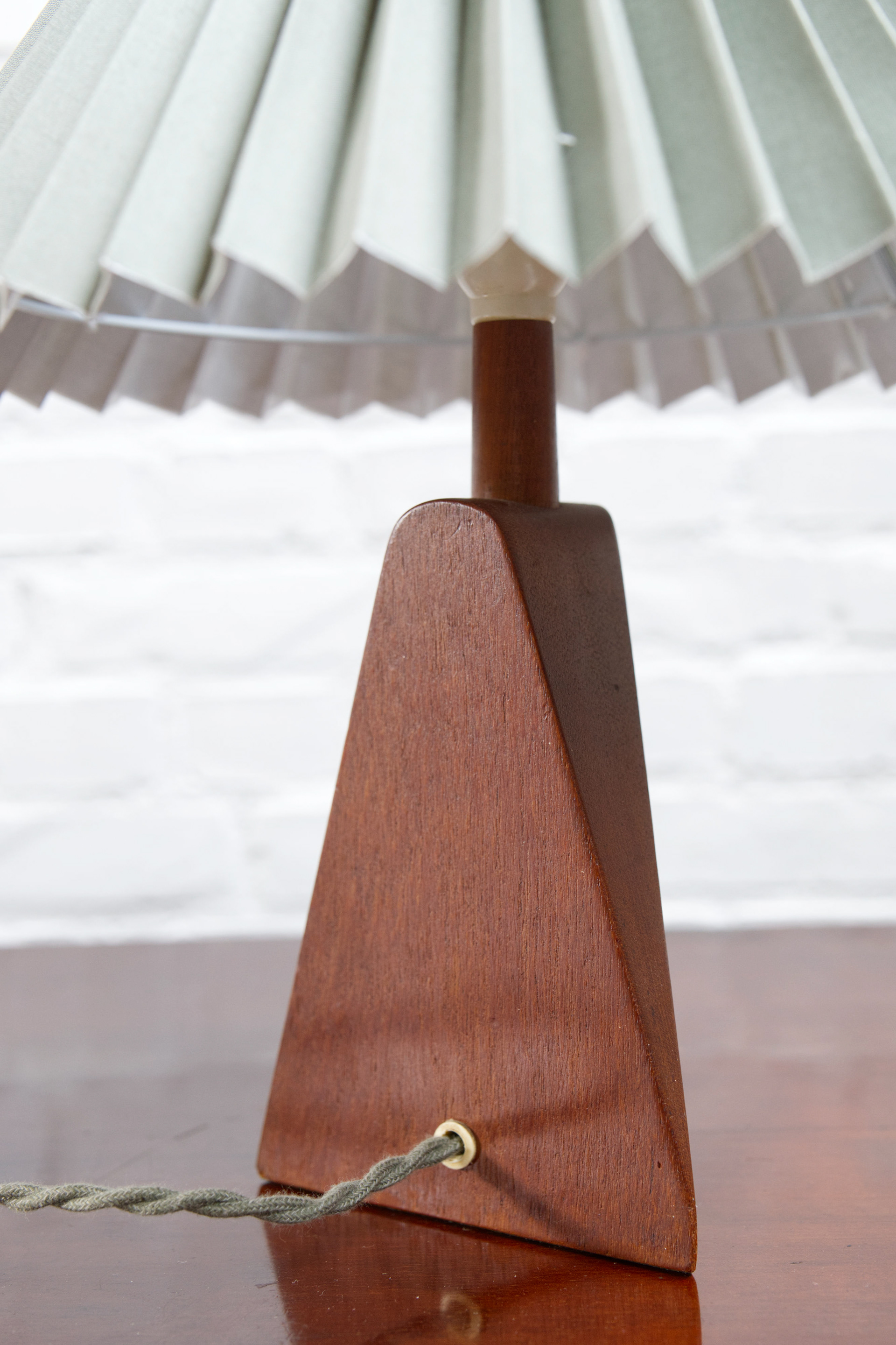 A beautiful example of Danish mid-century craftsmanship, this 1960s table lamp features a sculptural teak base with elegant inlaid beech detailing. The rich wood tones and subtle contrast create a warm, organic presence, typical of Scandinavian design from the era. Topped with a new pleated linen shade in a light green hue, the lamp casts a soft, inviting glow. The shade’s color adds a unique vintage charm while complementing the natural wood base perfectly. In excellent vintage condition with light, age-appropriate wear. Fully functional with a standard E27 socket, new matching green wiring and bakelite switch.
