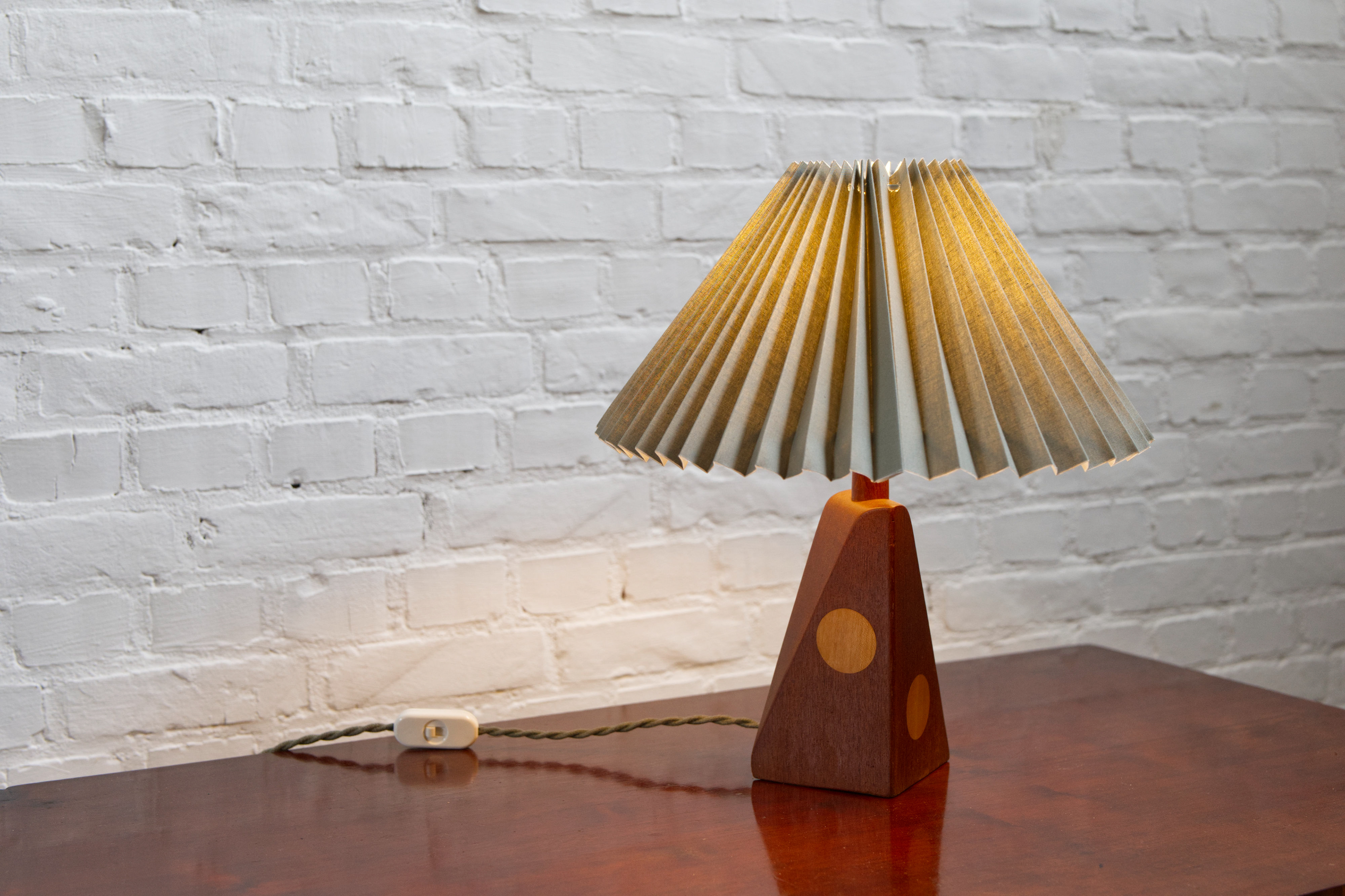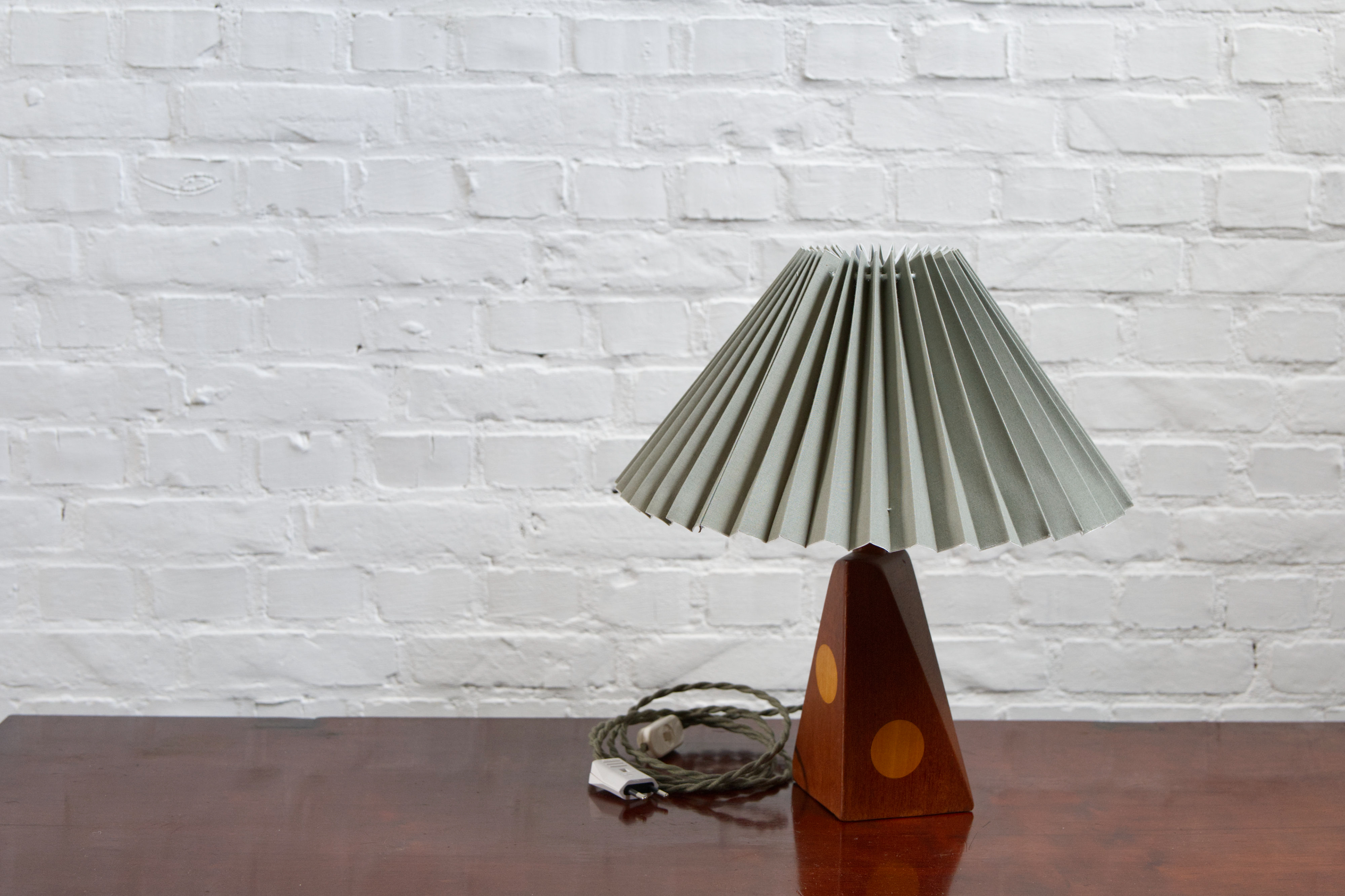 Danish Mid-Century Modern Teak Table Lamp with Inlaid Beech details an a Green Linen pleated Lampshade – 1960s