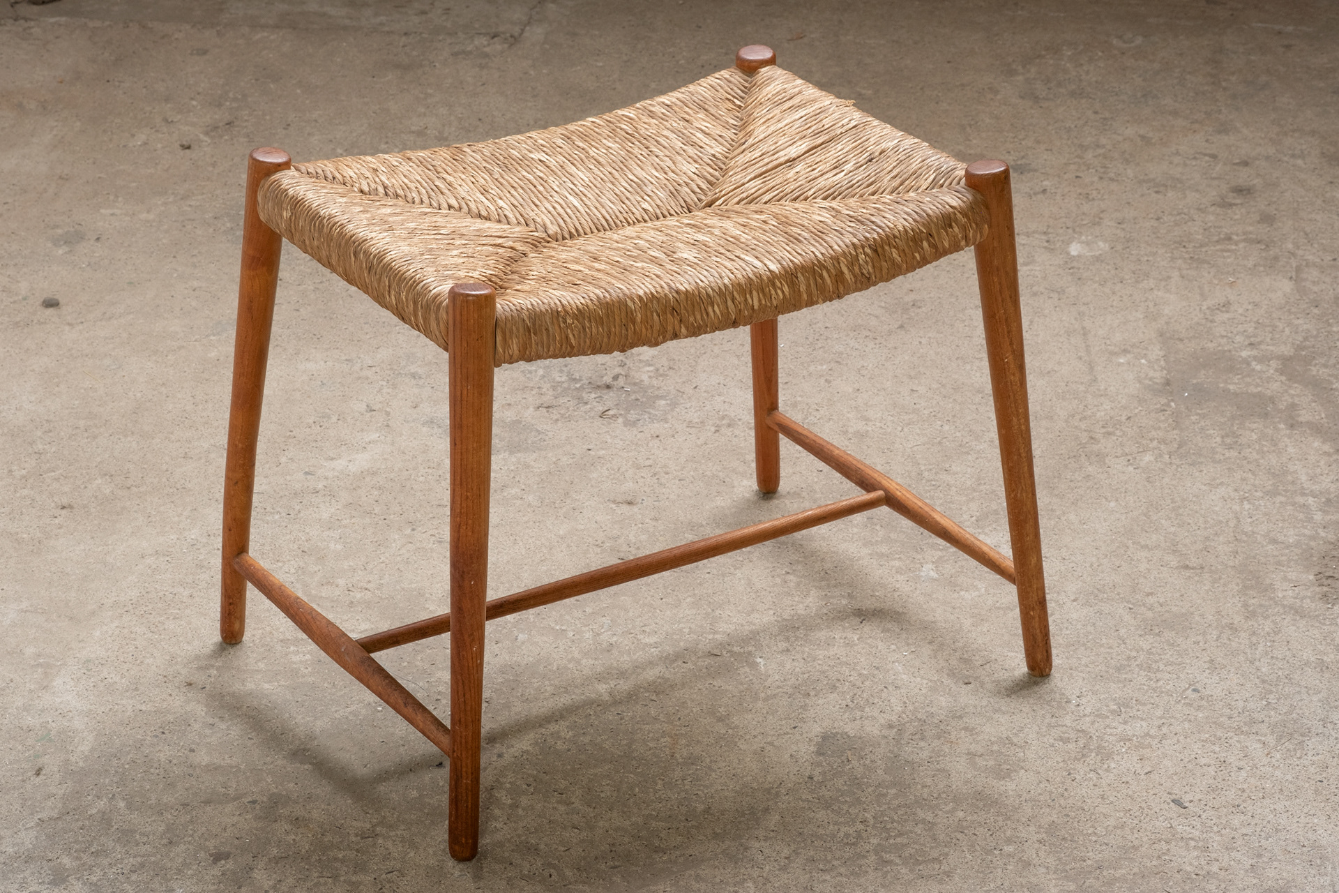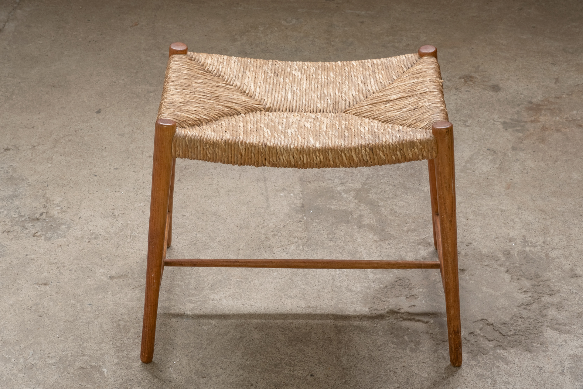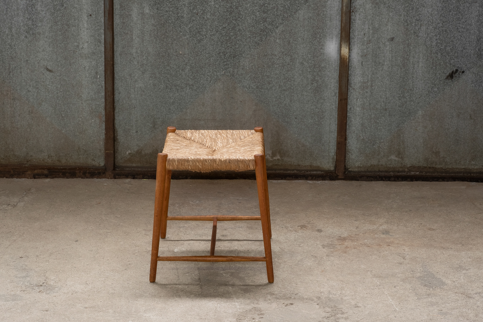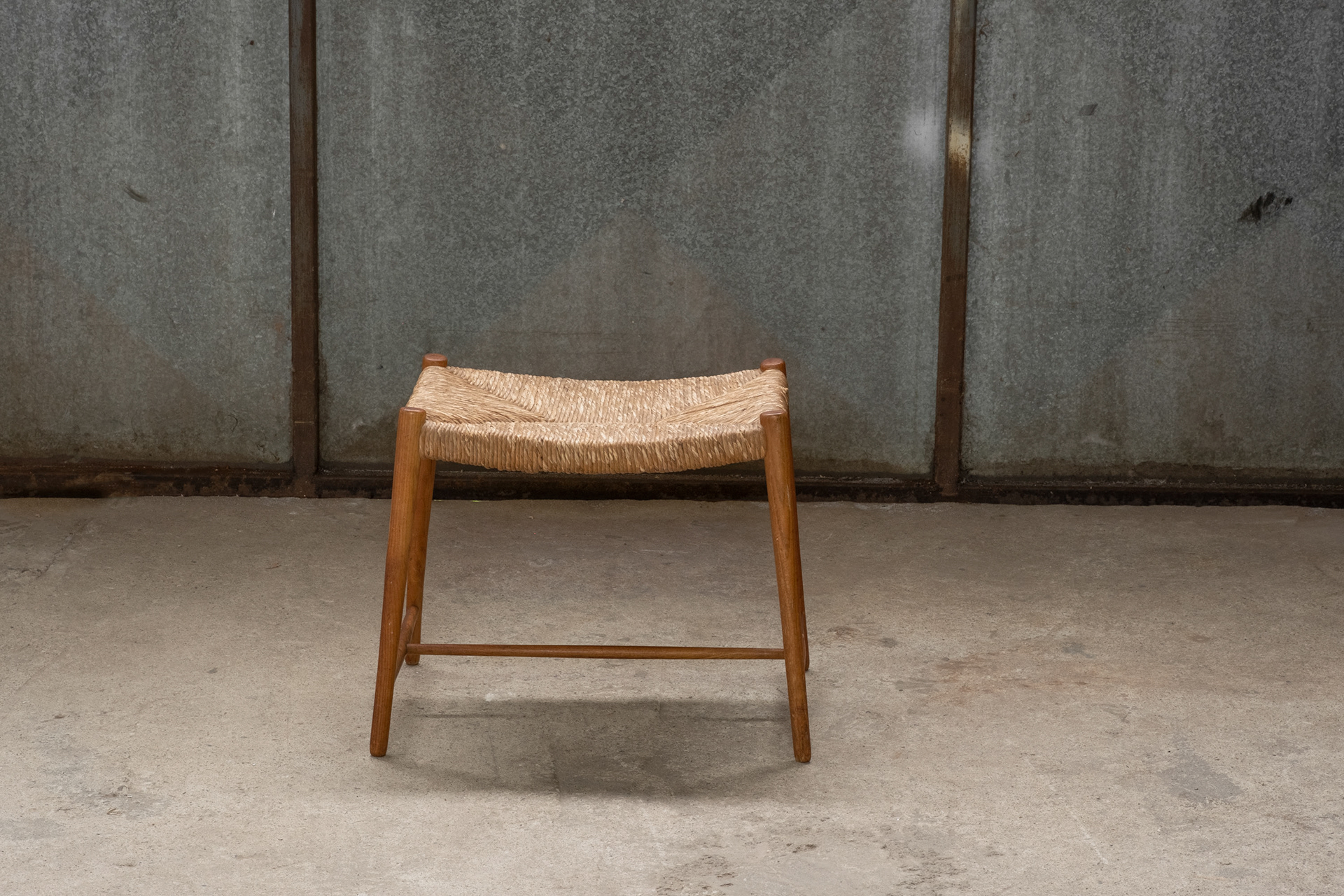 A wicker stool in teak, very pure and functional in design.